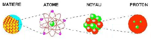 Avec ce dessin, vous pouvez voir que la matière est faite d'atomes, qui ont un noyau, qui est constitué de particules encore plus petites !